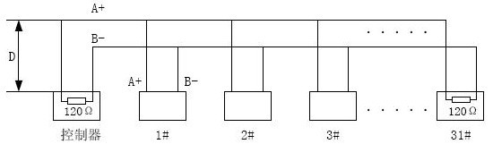 a) RS485工业总线标准要求各设备之间采用菊花链式连接方式,两头必须接有120Ω终端电阻。(如图1)简化连接可采用图2,但“D”段距离不得超过7 米