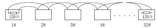 根据RS485 工业总线标准,RS485 工业总线为特性阻抗120Ω的半双工通讯总线,其大负载能力为32 个有效负载(包括主控设备与被控设备)