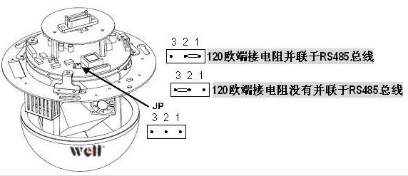 b) 设备终端120Ω电阻的连接方式:(如图3)设备终端电阻120Ω电阻在控制电路板上已备有,共有两种连接方式. 图3中为出厂时的缺省连接方式,此时控制电路板上的跳线帽插接在2~3插座位置上,这时120Ω电阻未接入。当需要接入120Ω电阻时,要将图中的控制电路上面的跳线帽从2~3位置拔下来,然后插接在1~2位置。这样120Ω电阻接入电路中。