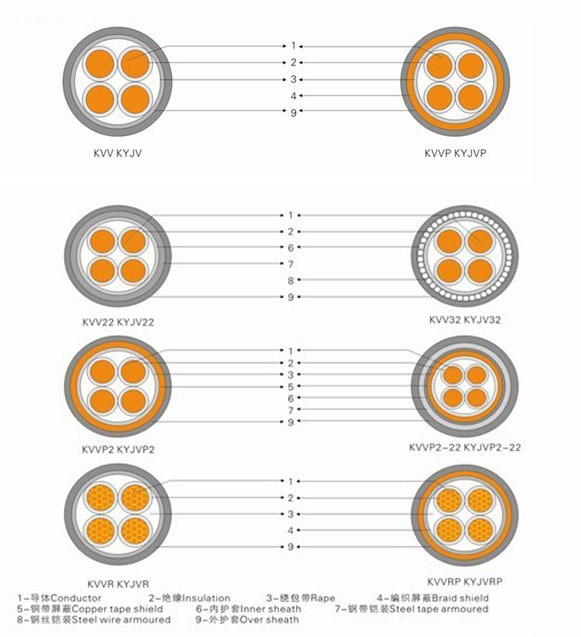 | KVV | 聚氯乙烯绝缘聚氯乙烯护套控制电缆 | 敷设在室内、电缆沟、管道等固定场合 |