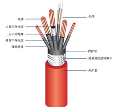 结构: 1.导体 无氧铜丝或镀锡铜丝 2.内部半导电层 3.三元乙丙绝缘(或抗撕硅橡胶) 4.外部半导电层 5.镀锡铜线和聚酰胺纱同心混合编织接地导体 6.光纤 7.外护套 聚氨酯或合成橡胶