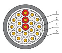 | 1、导体 2、绝缘层 3、包带 | 4、垫层 5、铜带屏蔽 6、外护层 |