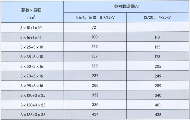 露天矿用高压(耐寒)橡套软电缆额定载流量(环境温度40摄氏度)