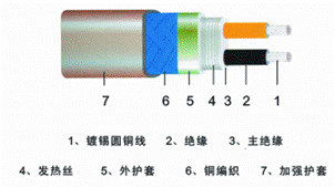 电源母线为两根平行的绝缘软铜线,在内绝缘上缠绕镍铬电热丝,并将电热丝每隔一定距离(即“发热节长”)与母芯线连接,从而形成连续的并联电阻。母芯线通电后,各关联电阻发热因而形成一条连续的加热带,而且可以根据使用情况发热节长度任意剪接。