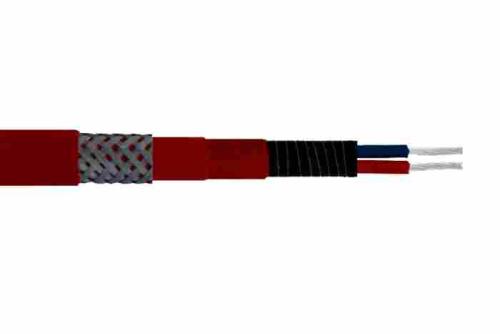 温控伴热电缆(自限温电热带)的电热元件,是在两根平行金属母线之间均匀地挤包一层PTC材料制成的芯带。电缆一端的两根母线与电源接通时,电流从一根母线横向流过PTC材料层到达另一根母线,PTC层就是连续并联在母线之间的电阻发热体,将电能转化成热能,对操作系统进行伴热保温。芯带电阻随温度升高增大,到了高阻区,电阻大到几乎阻断电流,芯带温度便达到高限不再升高却自动限温。电缆的输出功率主要受控于传热过程以被加热体系的温度。