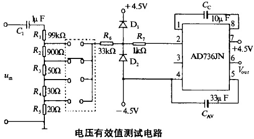 一般自限温伴热带在运行时电压基本上都是定值,比如220V,110V等。在整个的测试系统中电压测试部分主要是对电源进行监测,通过操作界面可以看到电压值的波动范围。为了得到电伴热带发热电阻的值,再结合前面测得的功率是有功功率值,所以对电压部分的测量采取测其真有效值的方式。电压有效值的测量是通过模拟乘法器AD736来实现的,它的作用是在输入范围内把交流量变成真有效值的直流量输出。具体电路如图4.由于AD736的输入范围限制,电路中需调压装置,由R 到R 来完成。为了保证AD736的输入范围在200mV以内(此范围输出的准确度最高),设立了如虚框内所示的量程开关,从上到下的测量范围分别是20V、220V、400V和1000V.其中的R 、D 和D 组成保护芯片的部分,以防AD736受到损坏。此部分的准确度通过实验表明,其相对误差低于2%。
