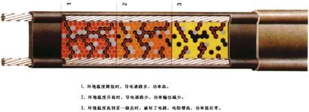 自限式电伴热带的带芯是一种很复杂的高分子复合物,它由多种材料和导电介质复合而成,经过特定的化学变化和物理处理之后挤出成型,在两条平行导线之间组成的一条保持连续平行的加热原件。在加热过程中,这个高分子材料的内部半导体通道的数量----电阻发生了惊人的正温度系数(简称PTC效应)的变化,且具有特殊的分子记忆能力,而且这种记忆性反应强烈。当环境温度升高时,高分子聚合物微分子膨胀,碳粒渐渐分开,引起了电路中断,电阻上升,伴热线自动减少功率输出;当环境温度降低时,高分子聚合物微粒间距又收缩变小,碳粒相应连接起来形成电路,伴热线发热功率又自动上升;当环境温度处于某一稳定状态时,系统将达到热输出稳定,使其具有温度自限性。它控制温度不会过高亦不会过低,能自动调解。从而,达到了安全可靠的目的。
